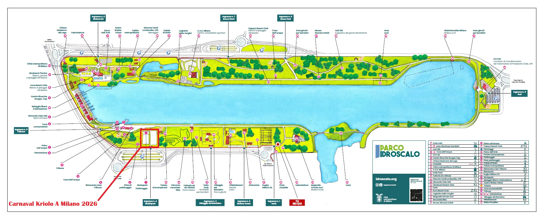 Com mais de 8000 m2 disponíveis, o carnaval Kriolo Milão Oferece  espaço amplo e estruturado, num dos espaços aos ar livre mais icônicos da Cidade de Milão, Conhecido como o "Mar de Milão".